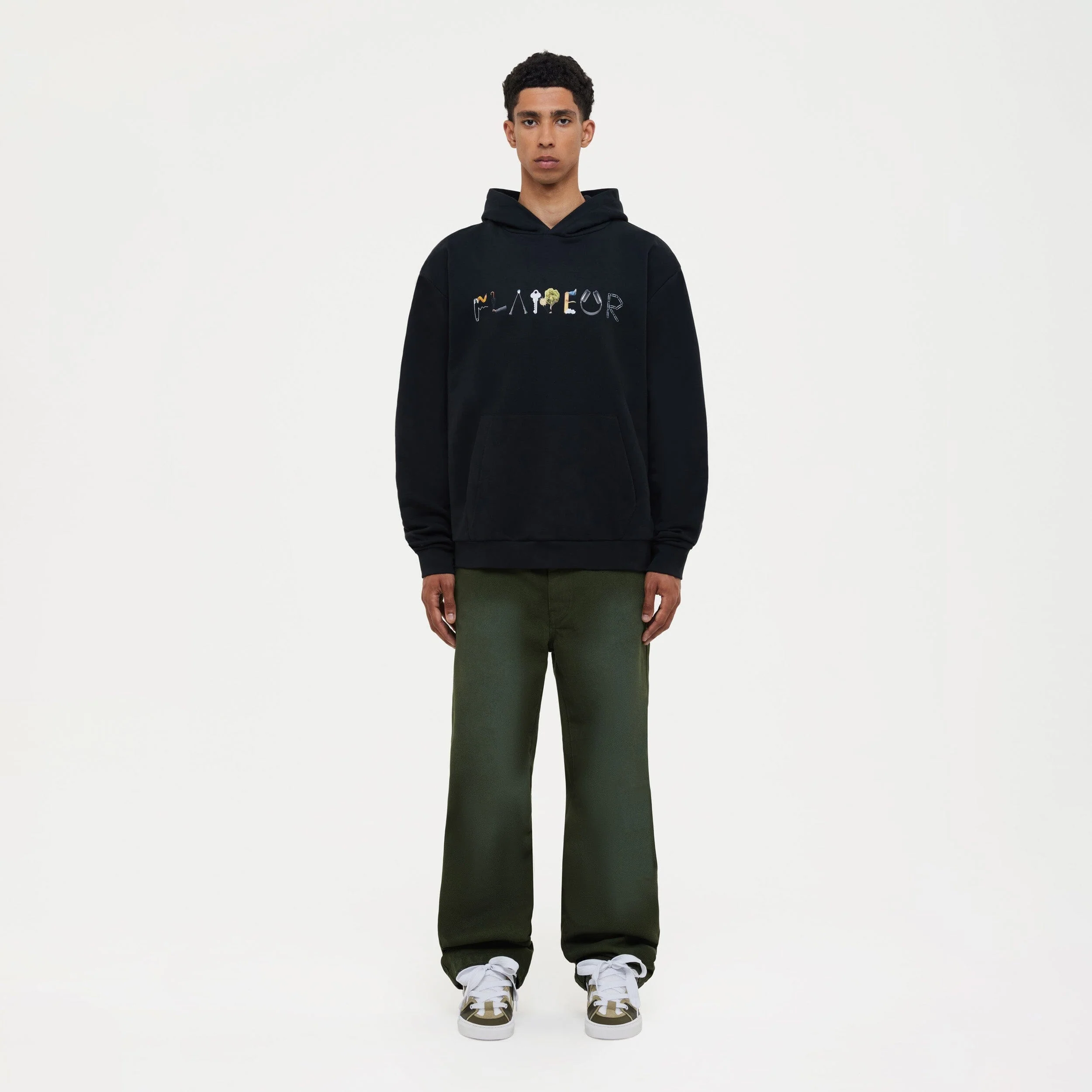 Hoodie with “Flâneur” front print formed by various objects.